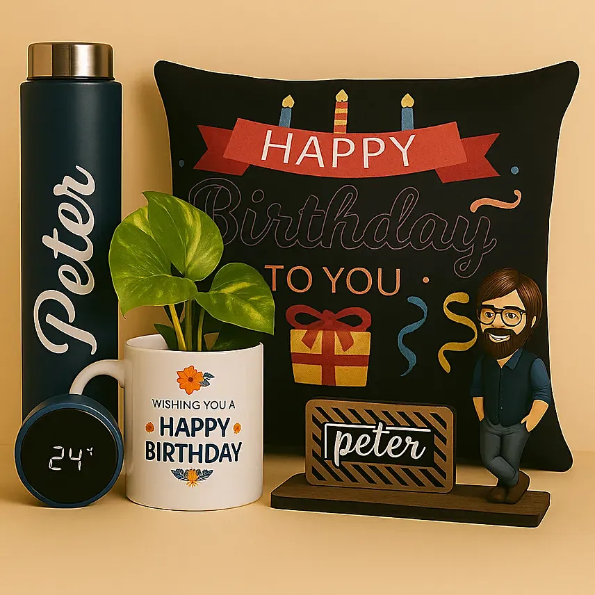 Make his celebration extra special with the Personalised Birthday Combo for Him a stylish and thoughtful gift set that blends personalization, greenery, and charm. Featuring a cheerful birthday cushion, a sleek temperature control bottle, a quirky caricature, and a lush money plant in a birthday mug, this combo perfectly captures warmth, fun, and sentiment.