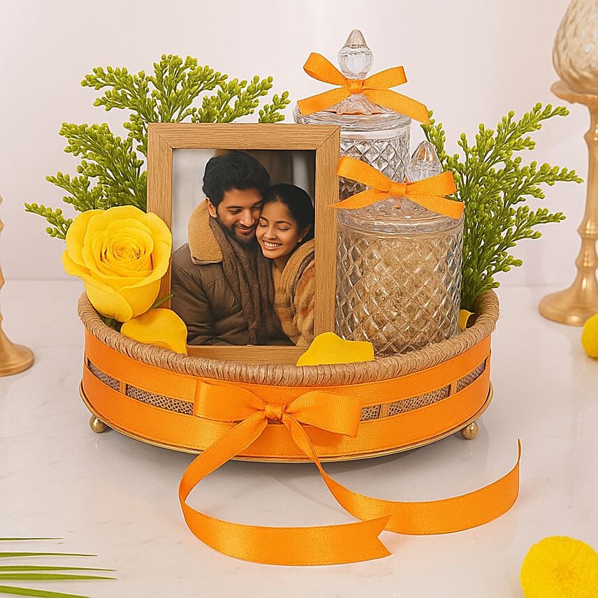 Celebrate love, togetherness, and beautiful memories with this elegant Personalised Frame and Roses Bundle.Thoughtfully curated with a customised photo frame, fresh roses, and delicious treats, this arrangement perfectly combines warmth, affection, and sophistication. Whether it’s for Bhai Dooj or any special occasion, this bundle makes every moment truly unforgettable.