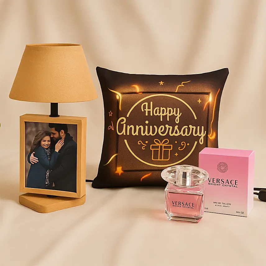Celebrate love and togetherness with the Personalised Anniversary Gift Set a beautifully curated combination of warmth, light, and luxury. This thoughtful ensemble includes a personalised photo lamp, a glowing LED cushion, and the timeless fragrance of Versace Bright Crystal, creating a perfect way to express affection on your special day.