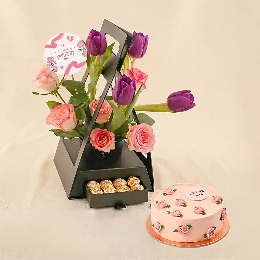 Premium Purple Tulip & Rose Hut Box with Chocolate Drawer Delight Mom with a sophisticated blend of fresh blooms and gourmet treats, elegantly presented in a modern silhouette.