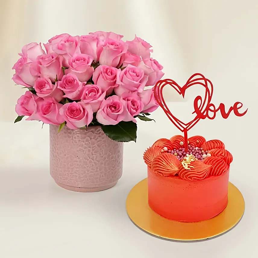 A soft and romantic arrangement of blush pink roses, beautifully gathered in a floral-print ceramic vase that adds charm, warmth, and elegance to any Valentine’s celebration.