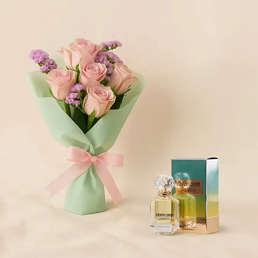 Delight in timeless beauty and elegance with this Roberto Cavalli Paradiso Perfume & Pink Roses Bouquet. A perfect harmony of fragrance and florals, this gift set combines the gentle allure of pink roses with the luxurious aroma of Roberto Cavalli Paradiso. Radiating freshness and sophistication, it’s a thoughtful and graceful gesture for any occasion.