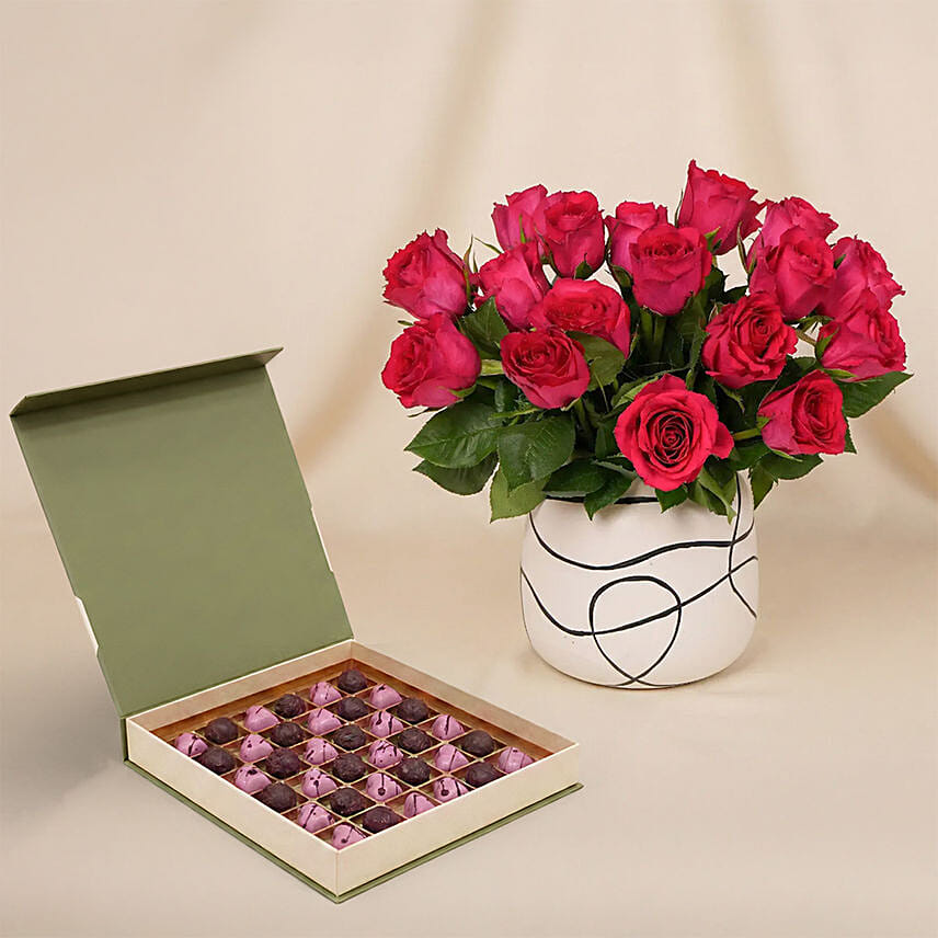 A striking display of deep pink roses arranged in a chic ceramic vase, this elegant floral piece blends modern design with timeless romance, making it a perfect Valentine’s statement.