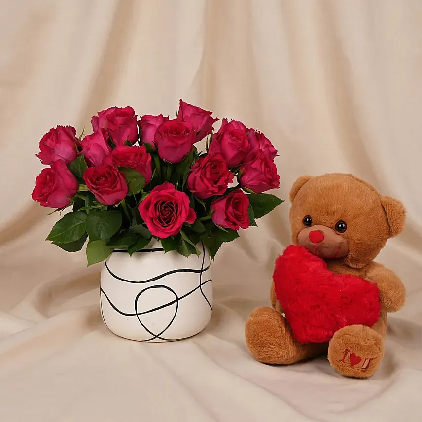 Romantic Dark Pink Roses & Teddy