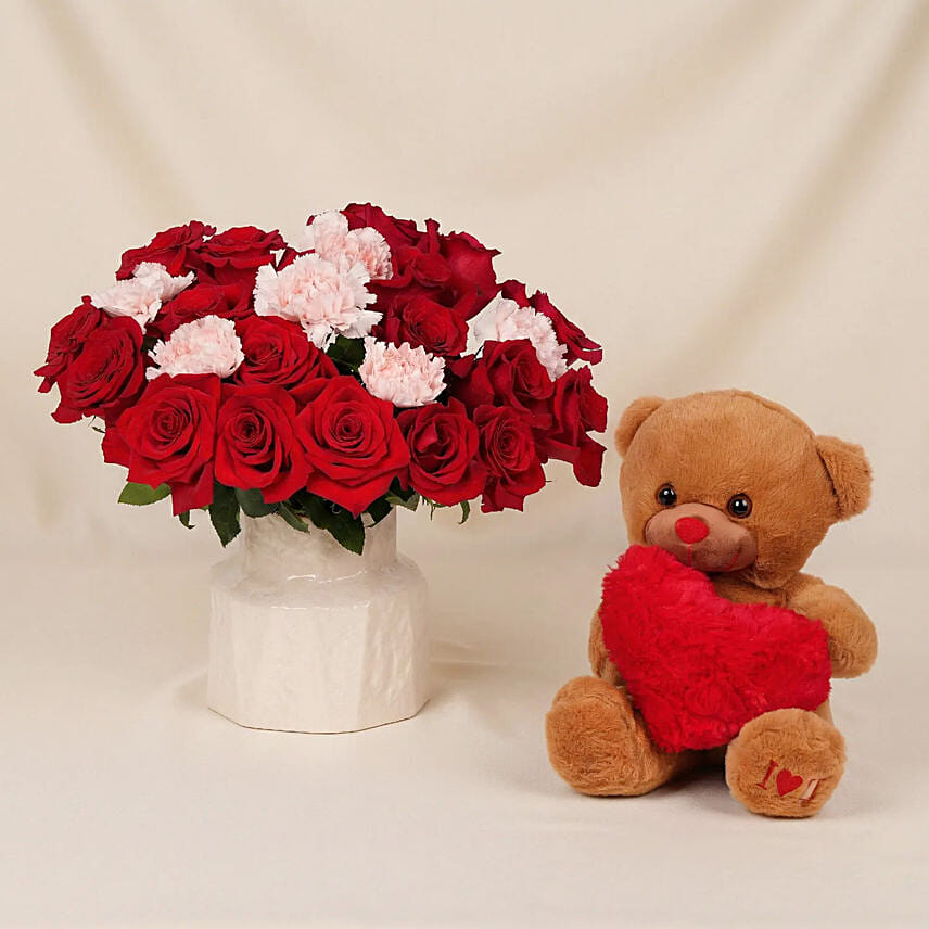 A heart-melting Valentine’s arrangement that pairs vibrant red roses and soft pink carnations with an adorable teddy bear holding a plush heart, all styled in a premium designer ceramic vase for an unforgettable romantic gesture.