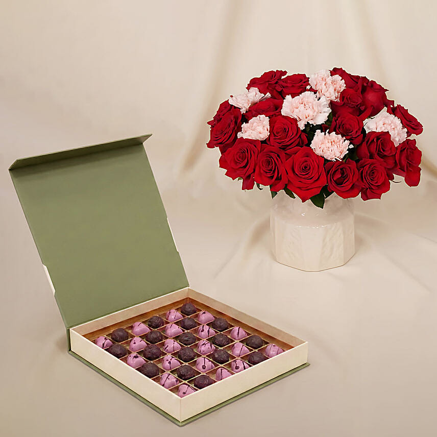 A striking blend of passionate red roses and soft pink carnations, this elegant arrangement is designed to express love with both intensity and tenderness, beautifully presented in a premium ceramic vase.