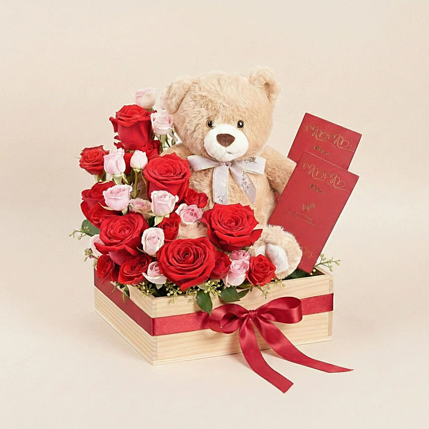 A heartwarming gift arrangement that blends romantic blooms, sweet treats, and cuddly charm, this beautifully curated box is designed to express love in the most thoughtful way. Perfect for creating unforgettable moments, it brings together flowers, chocolates, and a plush teddy in one elegant presentation.