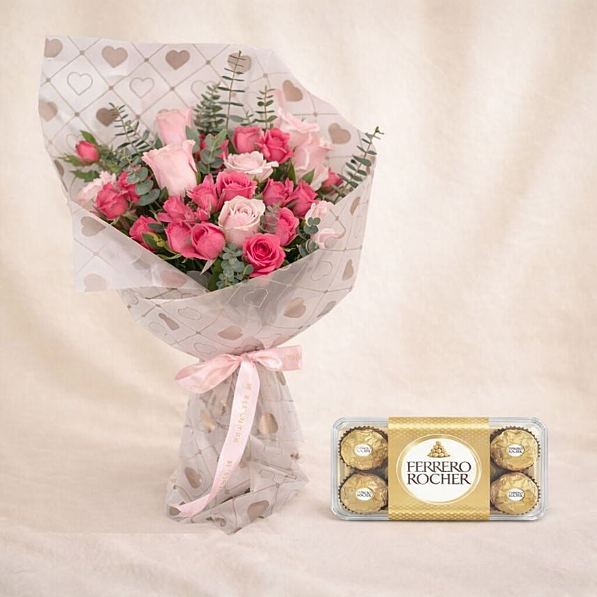 A soft and romantic bouquet layered with shades of pink and fresh eucalyptus, thoughtfully wrapped to create a graceful Valentine’s gesture full of warmth and tenderness.