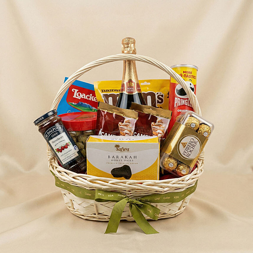 From luxurious chocolates and premium dates to crunchy biscuits and savoury snacks, each item is selected to create a balanced and enjoyable gifting experience. The elegant basket presentation adds a sophisticated finishing touch.