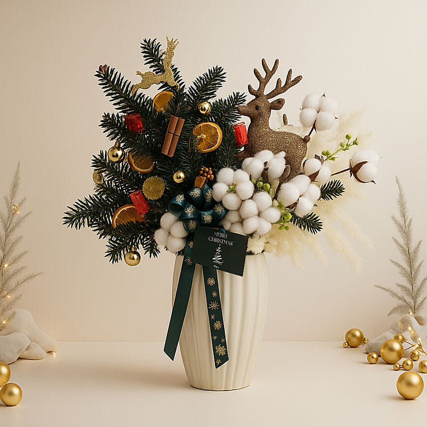 Bring the magic of winter indoors with our enchanting Snowfall Christmas Floral Arrangement—a dreamy blend of cotton blooms, festive evergreens, and elegant holiday décor.