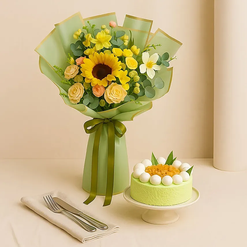 Sunbeam - Elegant Floral Fushion Bouquet & Pandan Ondeh Ondeh Cake