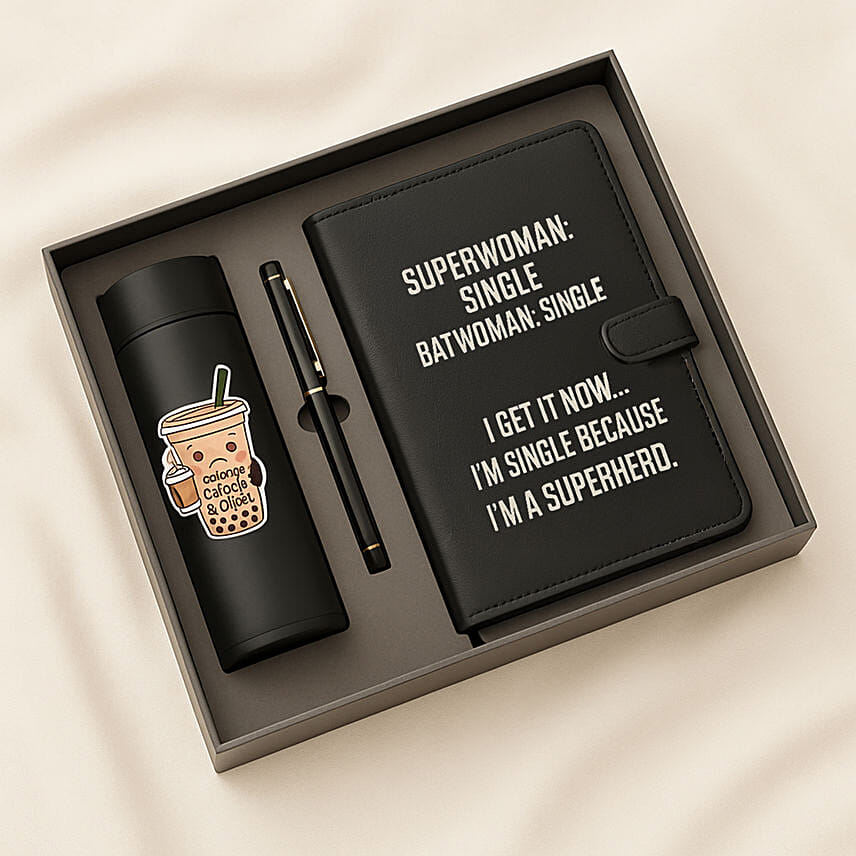 “Superhero” Notebook & Bottle Combo Gift Set is the perfect mix of sass, sophistication, and practicality - designed for those who embrace their independence with confidence and style. This empowering set features a bold quote that reads, “Superwoman: Single. Batwoman: Single. I get it now. I’m single because I’m a superhero.”, making it a fun and motivational gift for the everyday hero in your life.