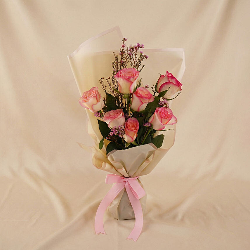 The soft pink roses symbolize gratitude, affection, and gentle love, while the delicate wax flowers add texture and a natural, garden-inspired touch. Wrapped in elegant paper and finished with a ribbon, this bouquet offers a simple yet sophisticated presentation.