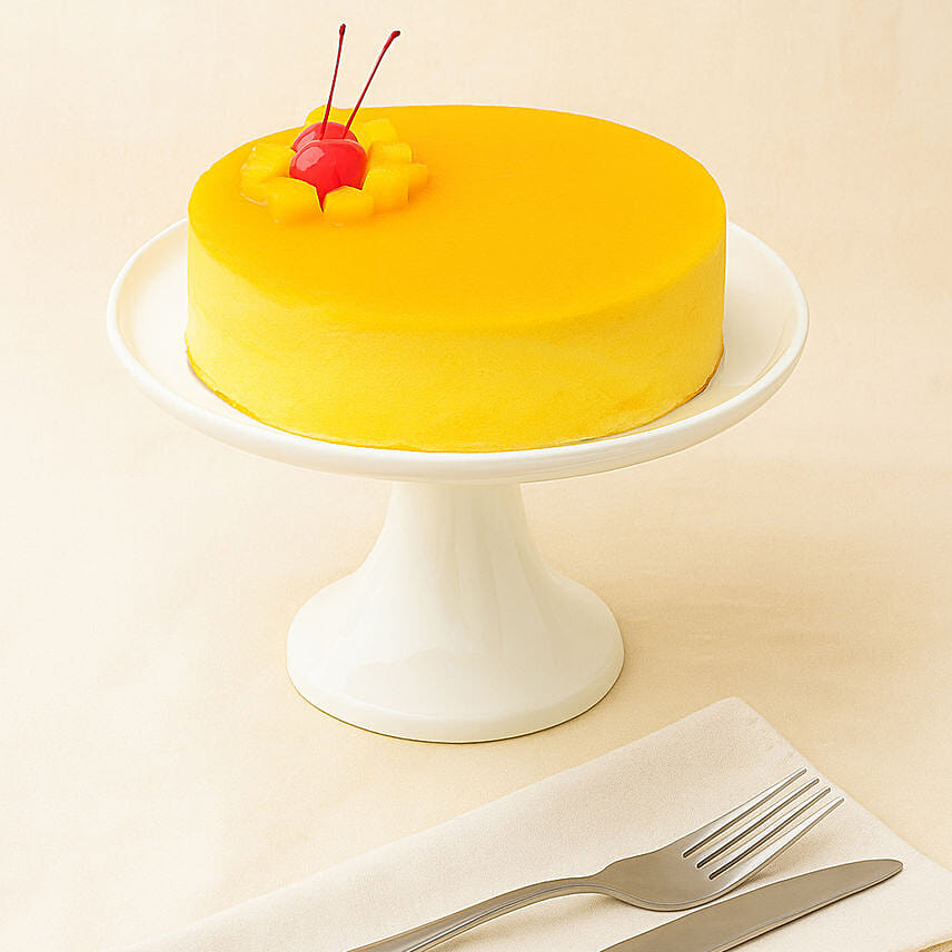 Indulge in the tropical fusion of flavors with the Tangy Mango Mousse Cream Cakes 6 inch round cake weighing approximately 650g, designed to serve 8 to 10 people. This exquisite dessert features a creamy mango mousse center, crafted from premium handpicked mangoes, enveloped in a soft, airy sponge. The cake is elegantly topped with fresh, juicy tropical fruits, adding both texture and visual appeal. Delivered complete with cutlery and two small candles, it's ready for immediate enjoyment. Upon receipt, refrigerate immediately and consume within 24 hours to ensure optimal freshness and flavor.