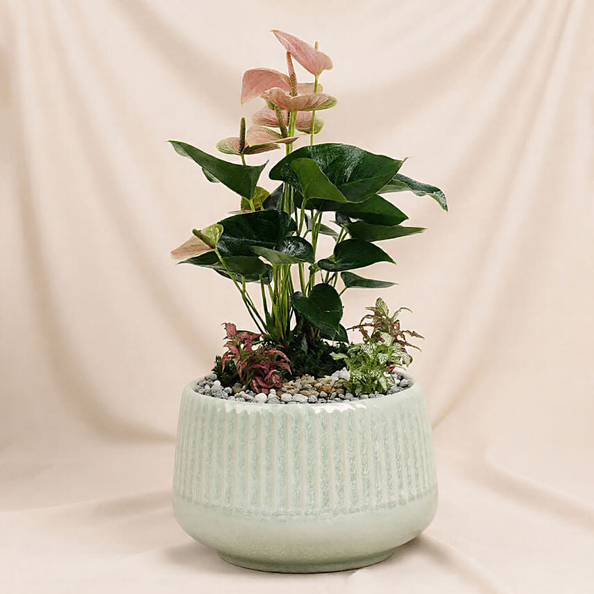 Elegant and refreshing, this Timeless Pink Anthurium Garden is a beautifully curated indoor plant arrangement that brings softness and natural charm to any space. Featuring delicate pink Anthurium blooms paired with lush green foliage and vibrant Fittonia plants, it is thoughtfully styled with contrasting stone pebbles for a balanced, modern look.