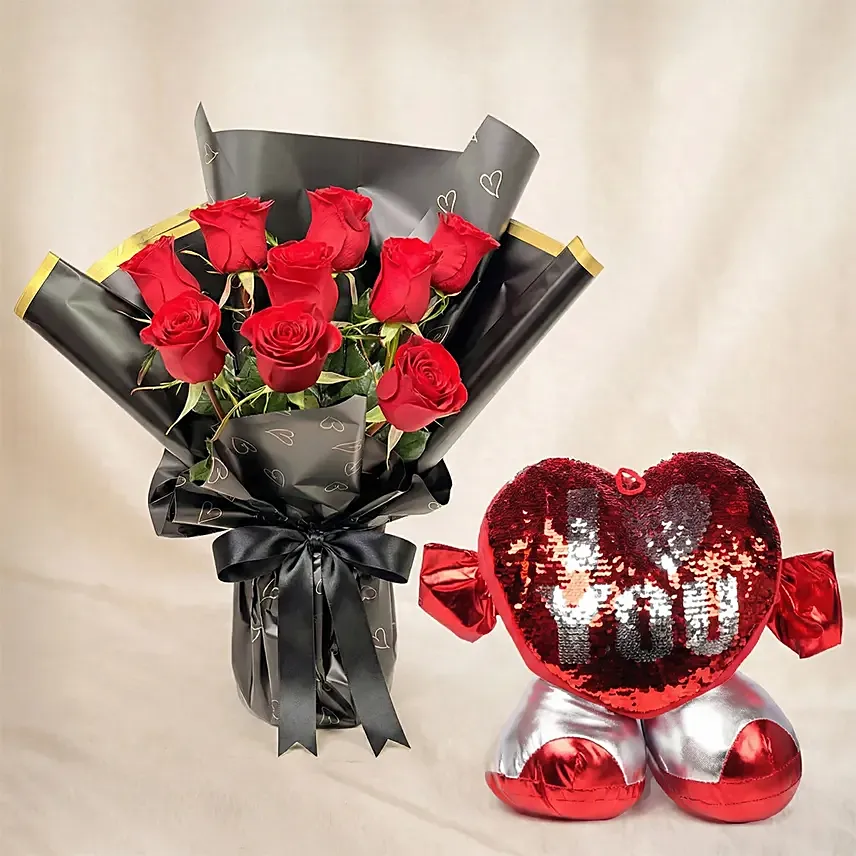 Valentine's Day 9 Roses Bouquet n Cushion Set