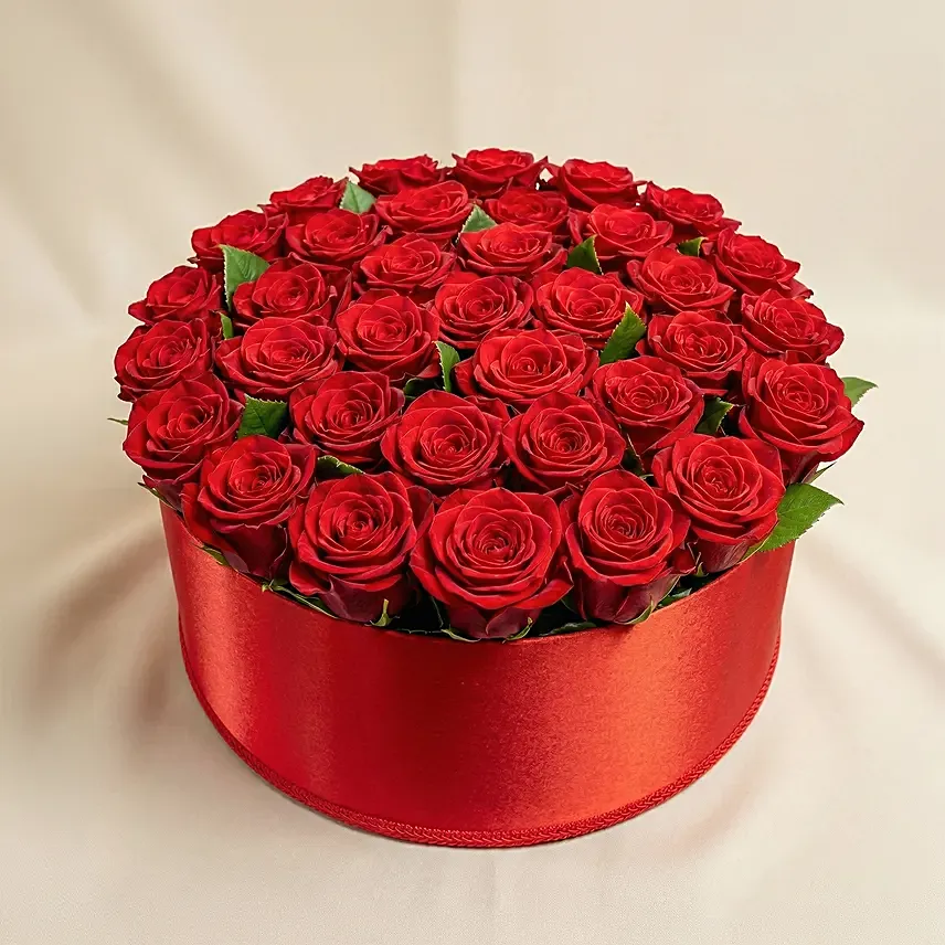 Make a bold and unforgettable statement of love with this breathtaking arrangement of vibrant red roses, beautifully styled in a classic round red box to symbolise passion, devotion, and timeless romance.