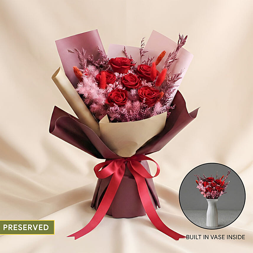 2-in-1 Premium Eternal Bouquet + Vase Why settle for just a bouquet when you can give a complete home decor piece? Our 2-in-1 Eternal Love Series features premium preserved blooms with a vase built directly into the bouquet. It arrives as a stunning, hand-wrapped gift, but hides a secret: once unwrapped, it is a perfectly styled, self-standing arrangement ready to brighten any room. No searching for a vase, no trimming stems - just instant elegance.