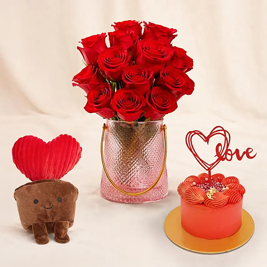Elevate any space with the Radiant Roses in Elegance Vase, a premium arrangement of lush red roses beautifully presented in a vase with a chic handle, blending classic charm with modern elegance.