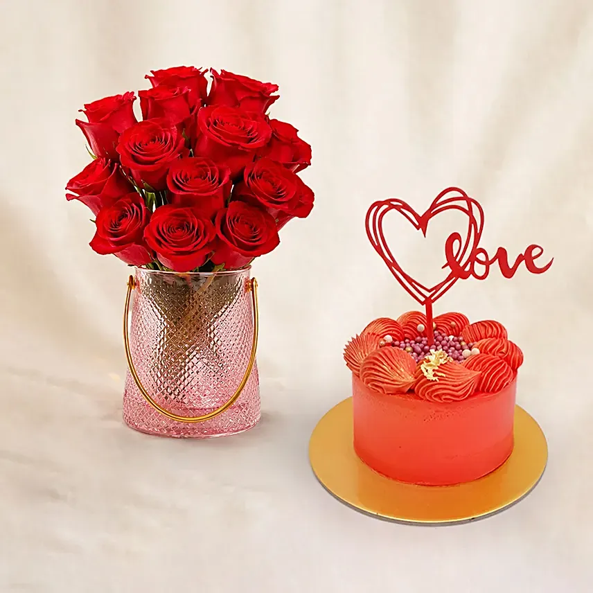 Valentine's Roses Elegance Vase n Cake Bundle Gift