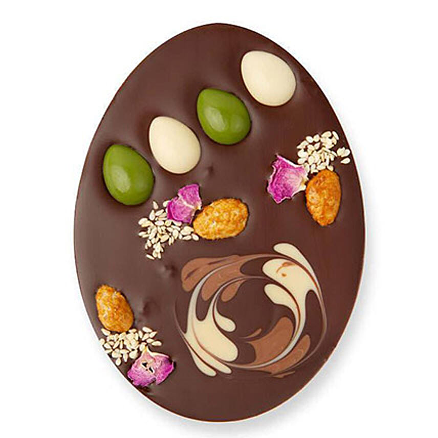 • Decorated with two small green tea chocolate and two white coconut chocolate eggs, roasted sesame brittle, fragrant rose petals, and candied almonds