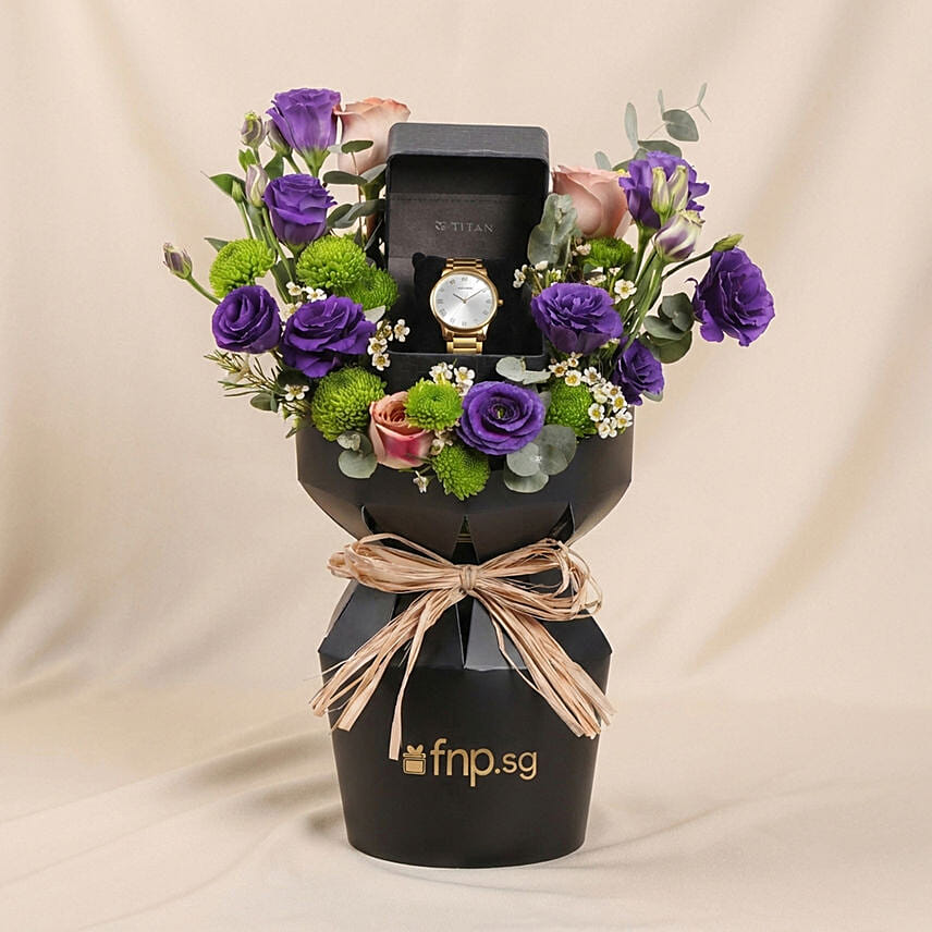 A refined fusion of florals and timeless style, this elegant arrangement pairs soothing purple and peach blooms with a classic Sonata men’s watch-making it a thoughtful gift that speaks of care, sophistication, and lasting moments.